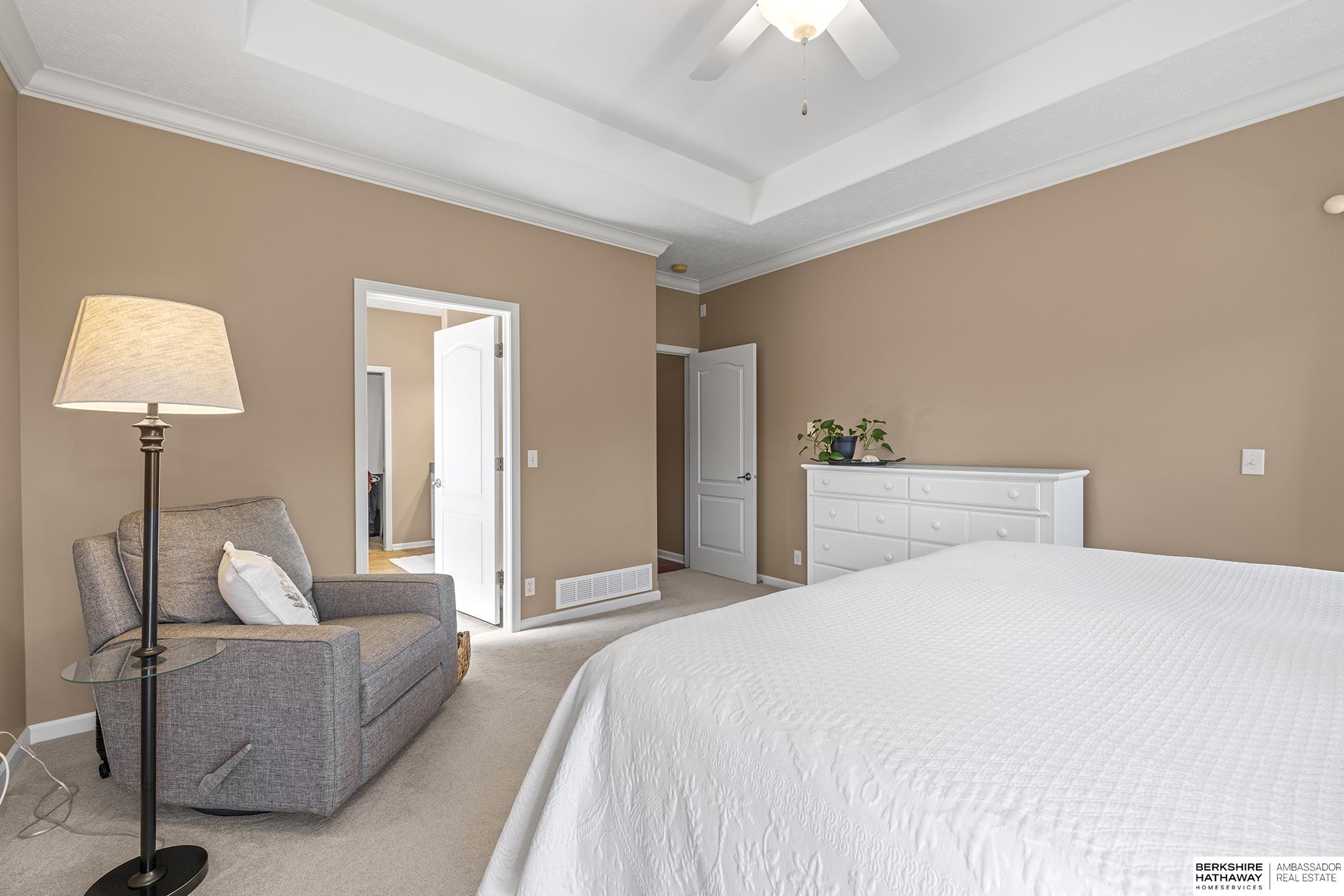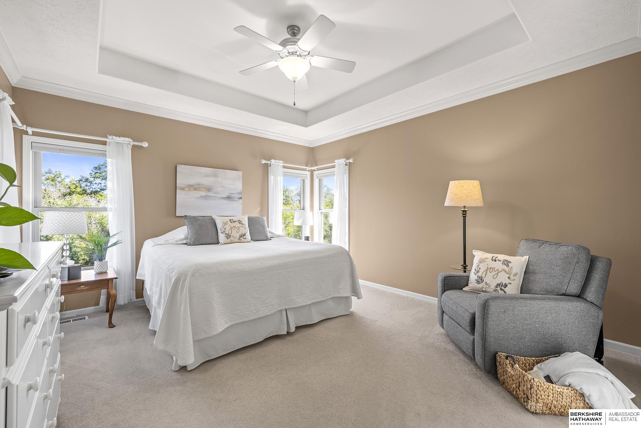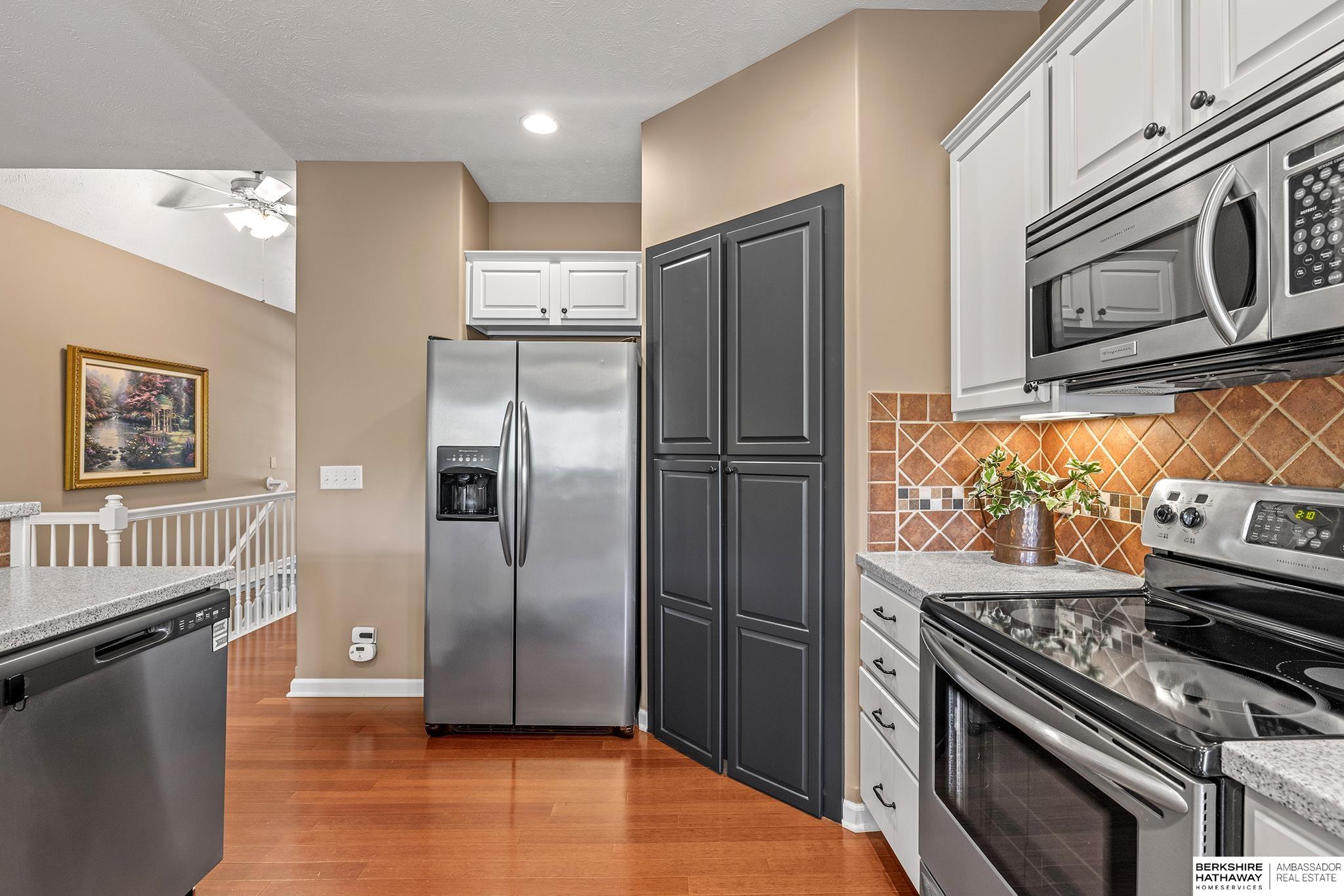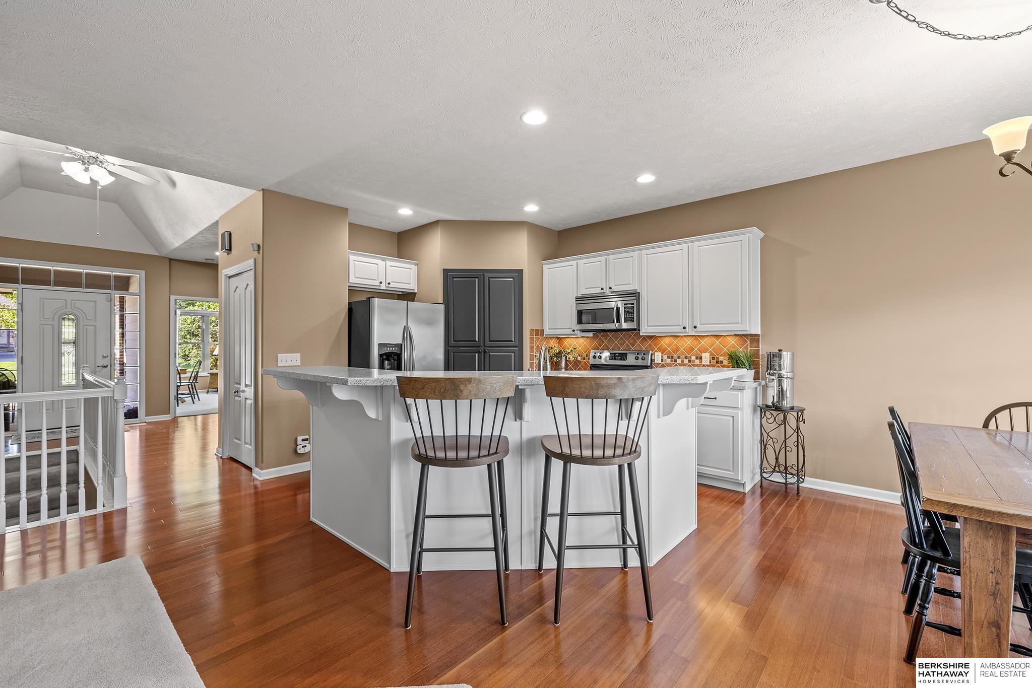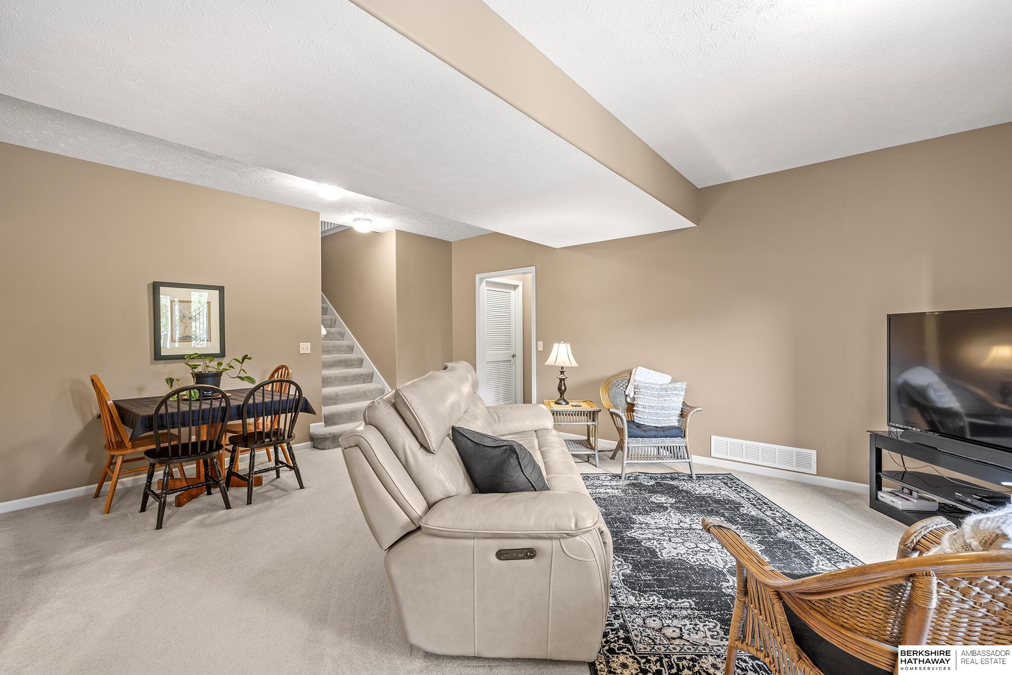 Spectacular 4-bed/3-bath, walkout ranch in the excellent Elkhorn School District! One owner, meticulously maintained, spacious, and spotless home with oversized, 3-car tandem garage and easy access to Dodge Street. Open-concept great room with gas fireplace flows to an airy kitchen and substantial pantry, which overlooks the newly updated pergola deck facing a secluded, forested tree line view; perfect for meditative moments viewing nature’s best variety of birds. Retreat to the primary suite with a whirlpool tub, shower, double sinks, and generous walk-in closet. The lower level features 2 beds (1 with walk-in closet), full bath, 2 sizable storage/exercise areas, and family room leading to a private, serene patio and landscaped fenced yard. Updates include sprinkler control panel, tiled flooring in all baths, custom room darkening shades, newer A/C and dishwasher, furnace blower/capacitor, sump pump, cabinetry, and more. Immaculate and detailed; truly move-in ready for you!