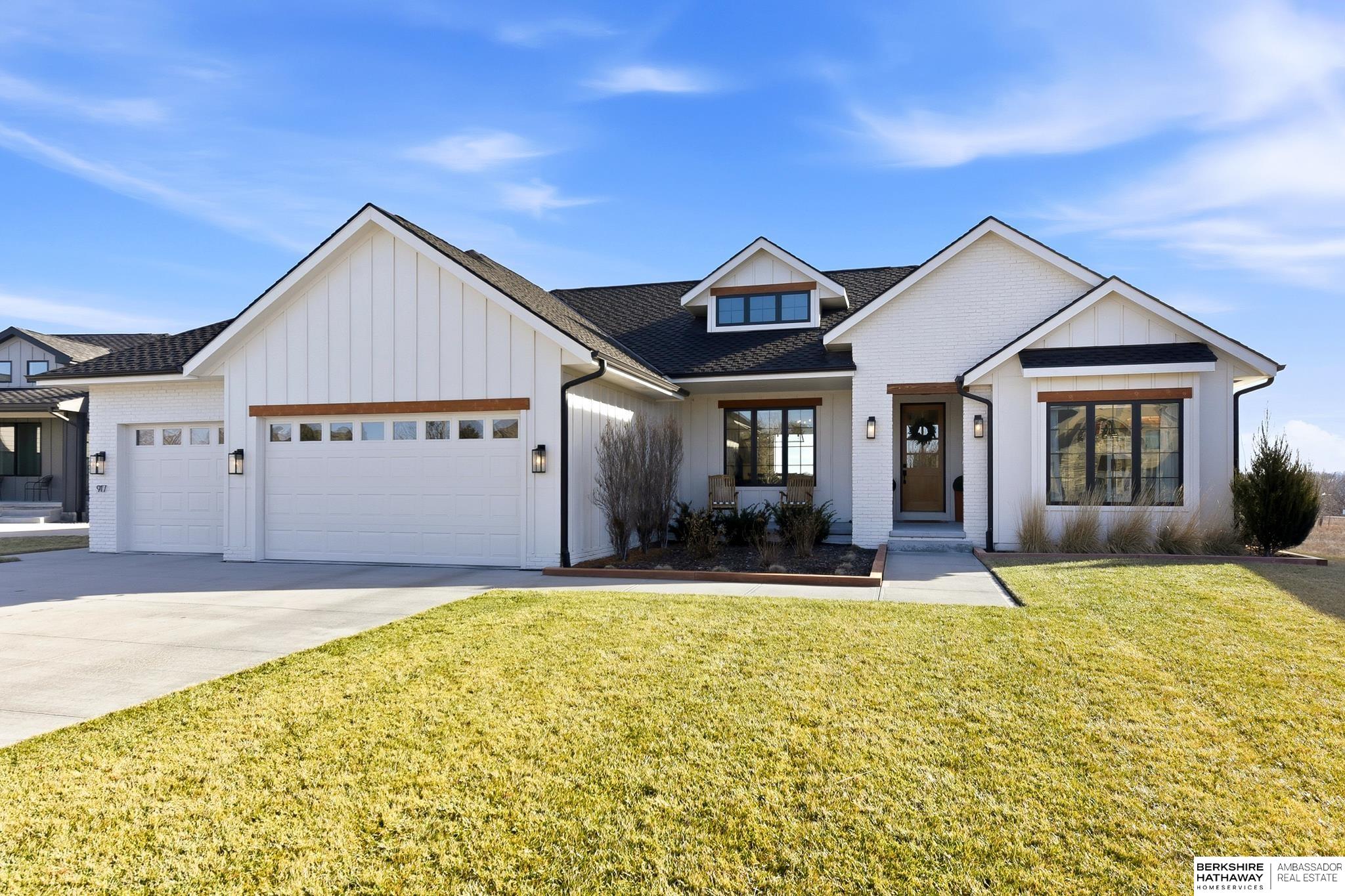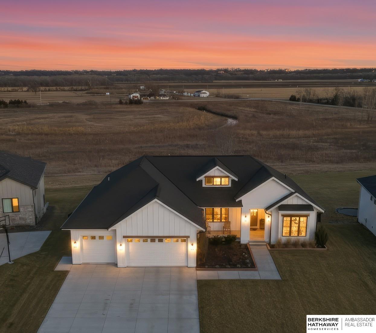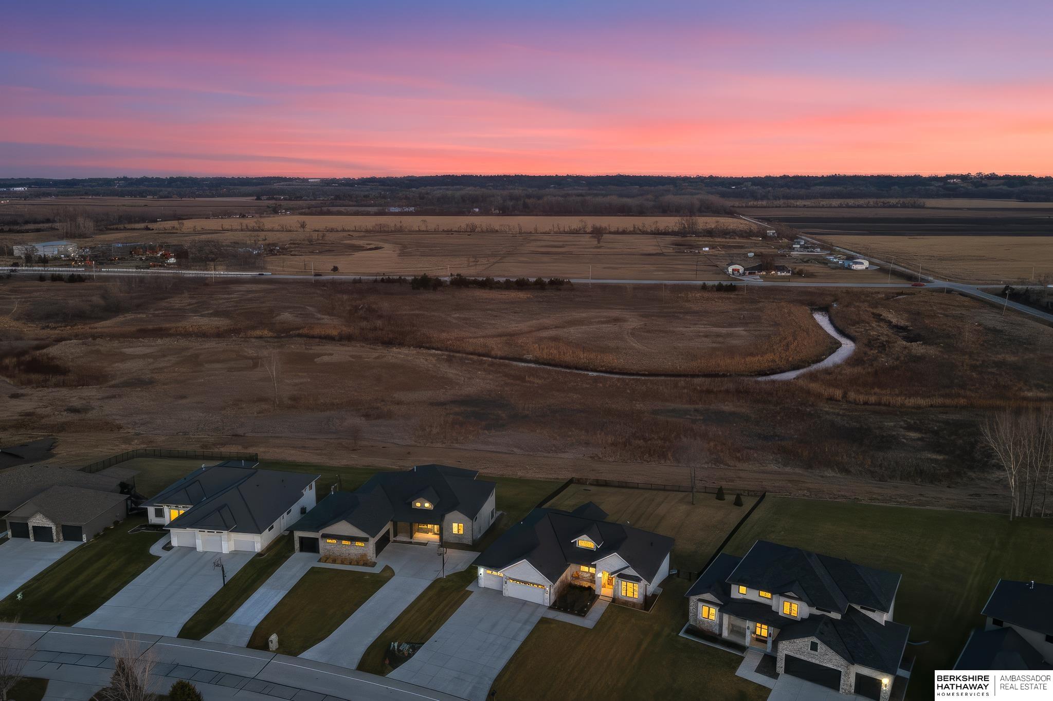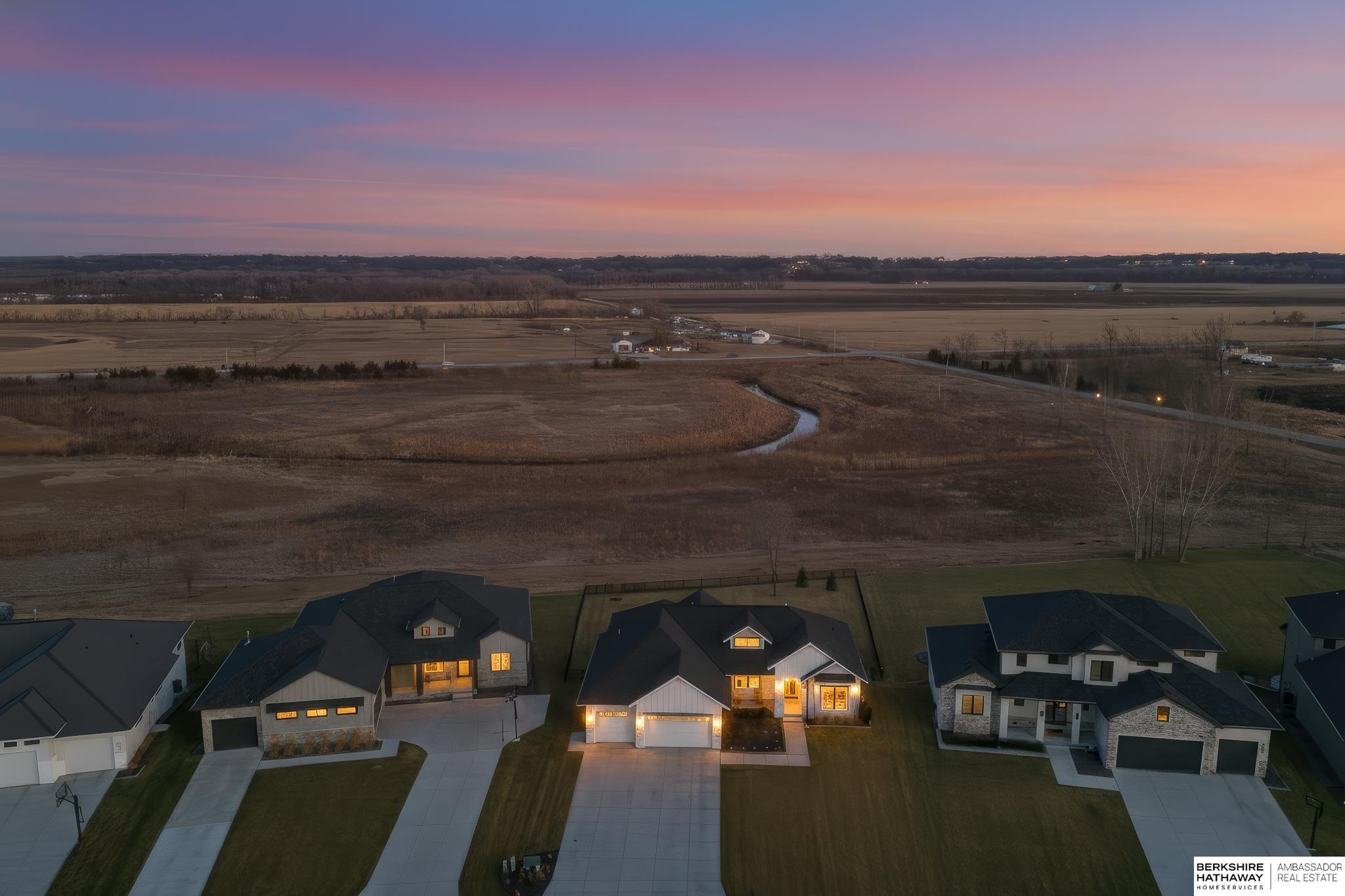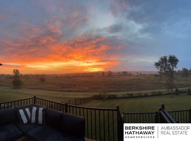 West Shores modern farmhouse home backing to a serene 100-acre HOA-owned wetland preserve. Enjoy access to a 203-acre recreational lake with marina and right to a boat slip, plus nearby trails and park amenities. Ideally located near Dodge and Center Streets, the home offers quick access to Omaha’s main thoroughfares while maintaining a peaceful, private setting. This custom walkout ranch features effortless main-level living with three spacious bedrooms, oversized windows, and abundant natural light. An expanded back deck overlooks the preserve with stunning sunrise views, while the front porch captures sunsets over the lake. The kitchen offers ample cabinetry, refined finishes, and a large butler’s pantry. The spa-like owner’s suite features a soaking tub, heated floor, and expansive walk-in shower. The lower level adds a large versatile bonus room and custom wine wall.