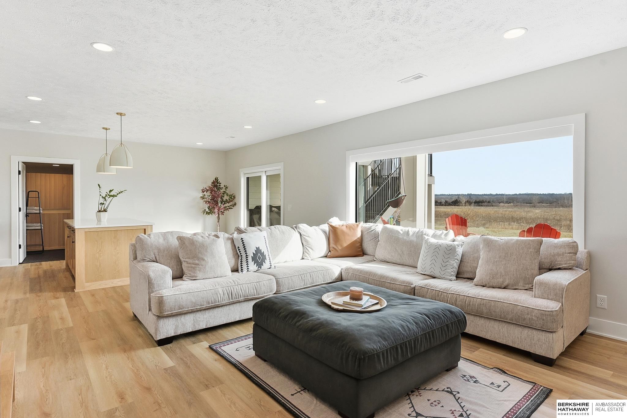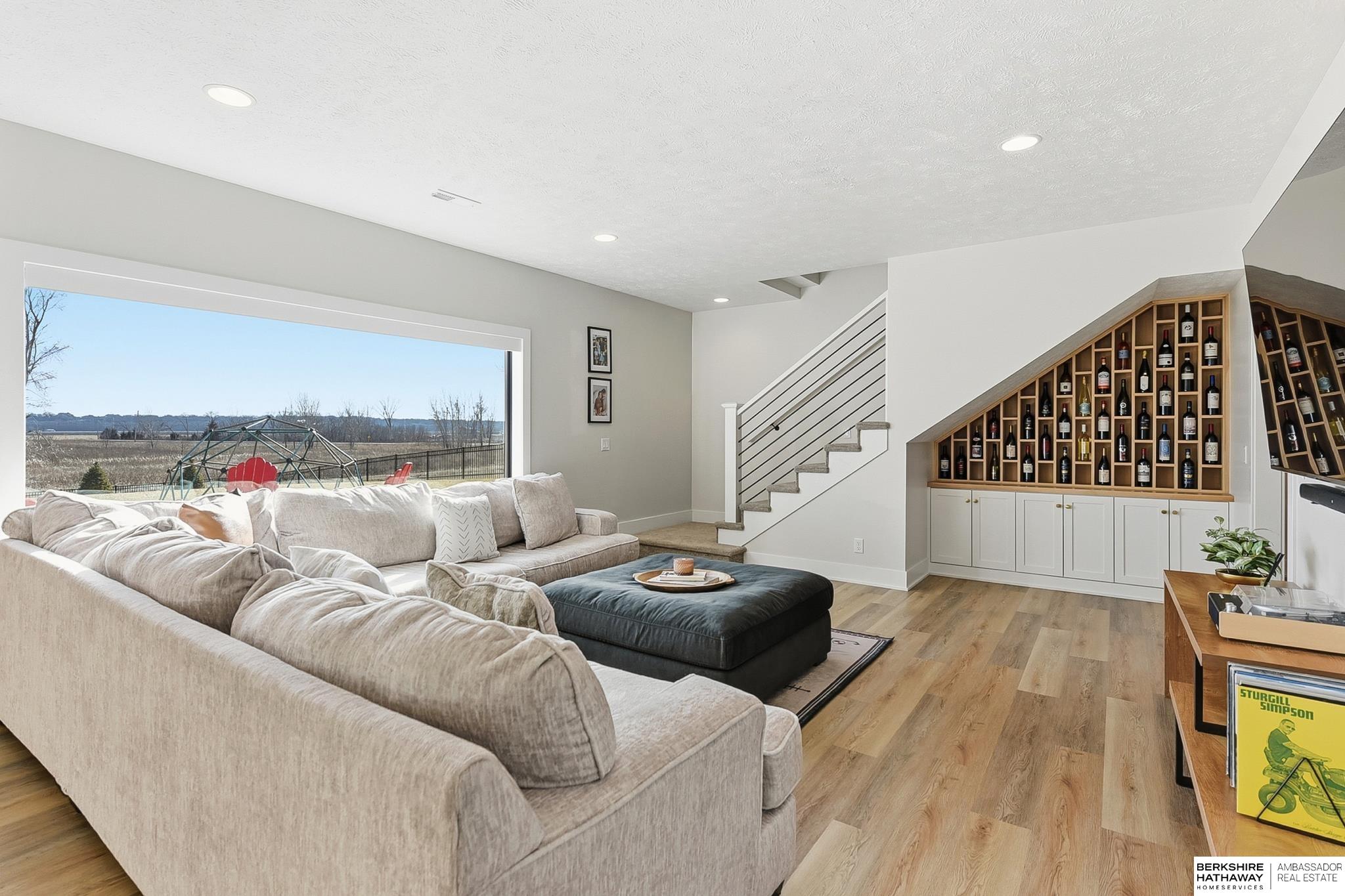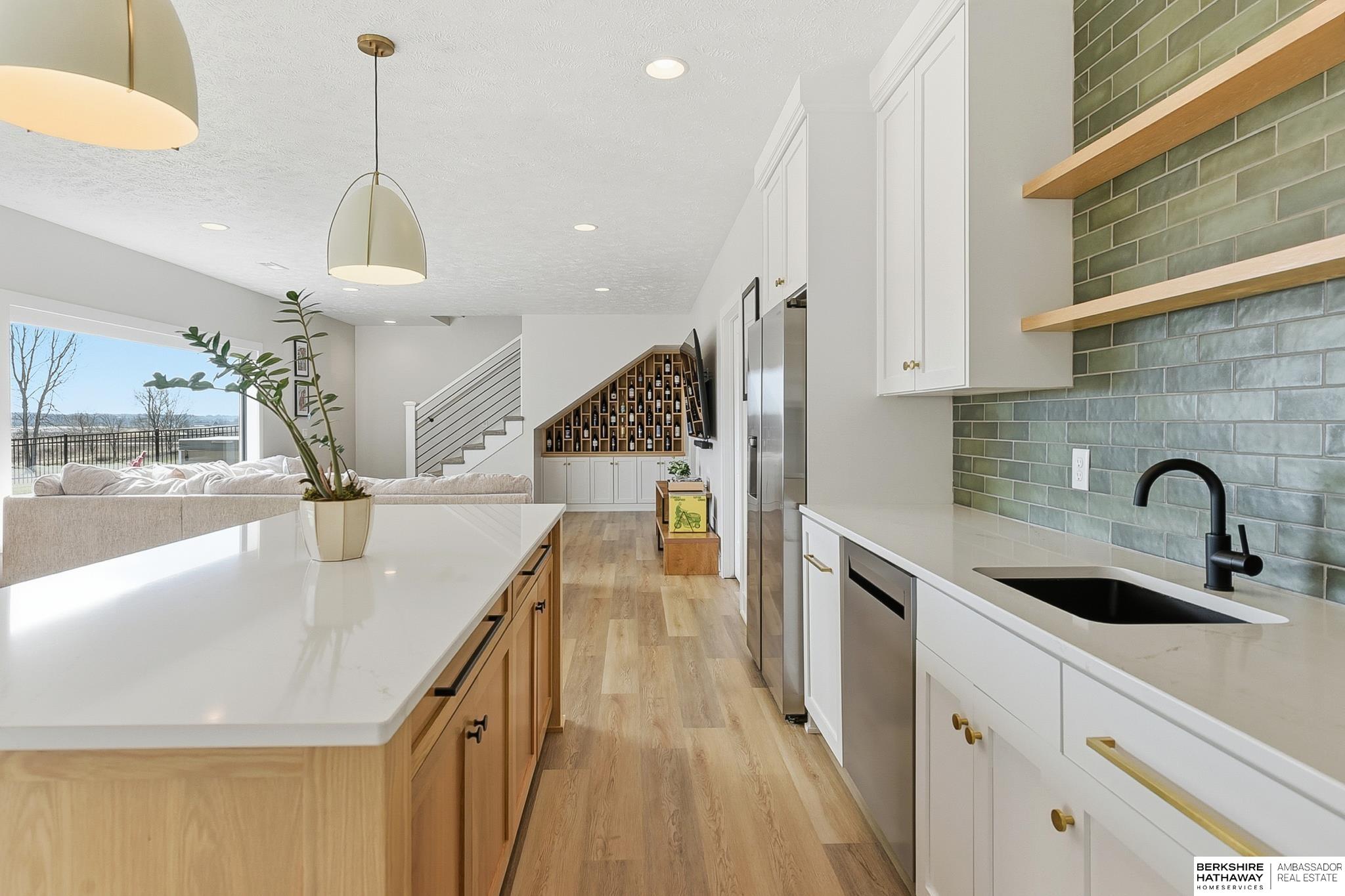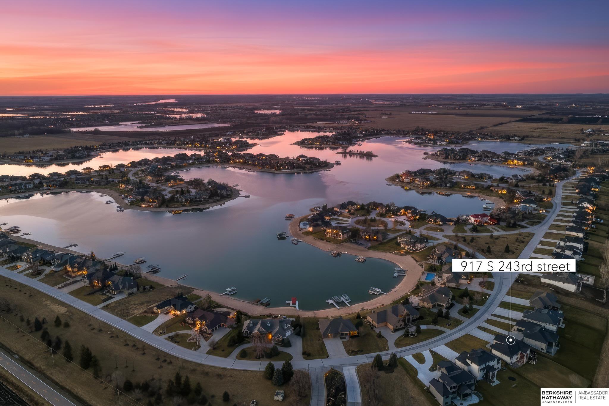 West Shores modern farmhouse home backing to a serene 100-acre HOA-owned wetland preserve. Enjoy access to a 203-acre recreational lake with marina and right to a boat slip, plus nearby trails and park amenities. Ideally located near Dodge and Center Streets, the home offers quick access to Omaha’s main thoroughfares while maintaining a peaceful, private setting. This custom walkout ranch features effortless main-level living with three spacious bedrooms, oversized windows, and abundant natural light. An expanded back deck overlooks the preserve with stunning sunrise views, while the front porch captures sunsets over the lake. The kitchen offers ample cabinetry, refined finishes, and a large butler’s pantry. The spa-like owner’s suite features a soaking tub, heated floor, and expansive walk-in shower. The lower level adds a large versatile bonus room and custom wine wall.
