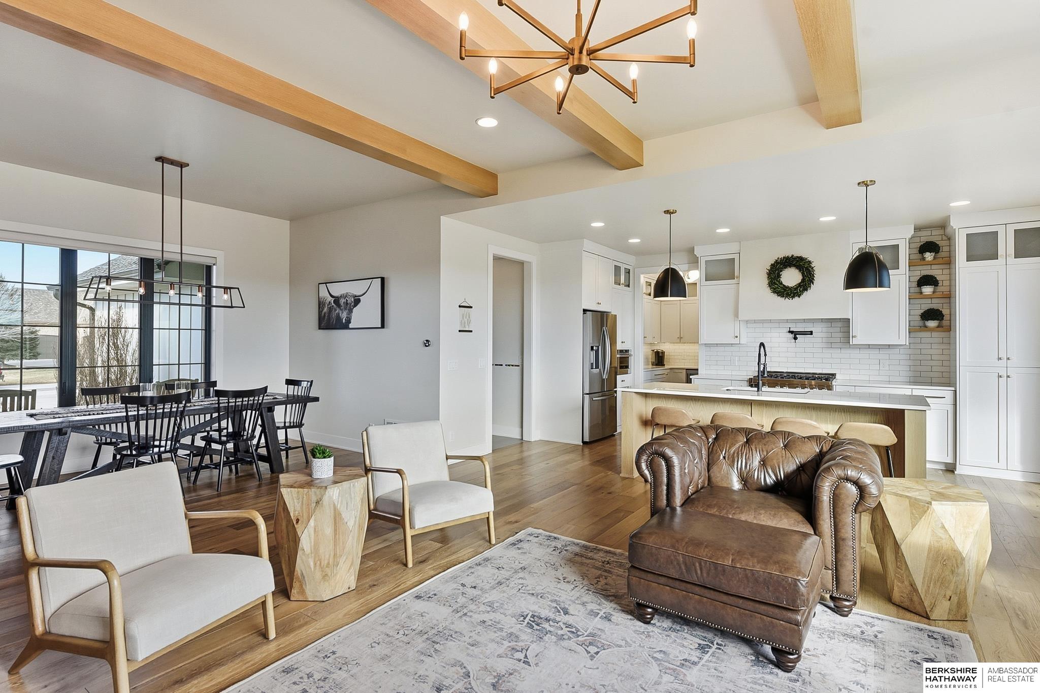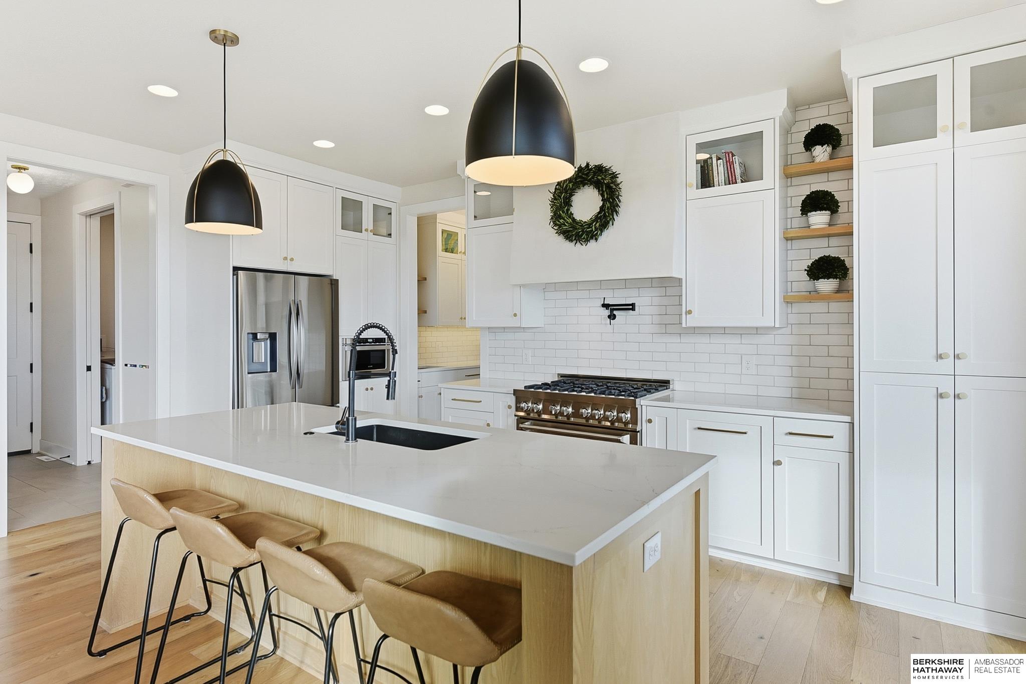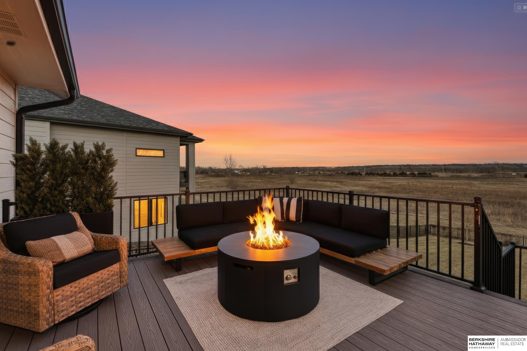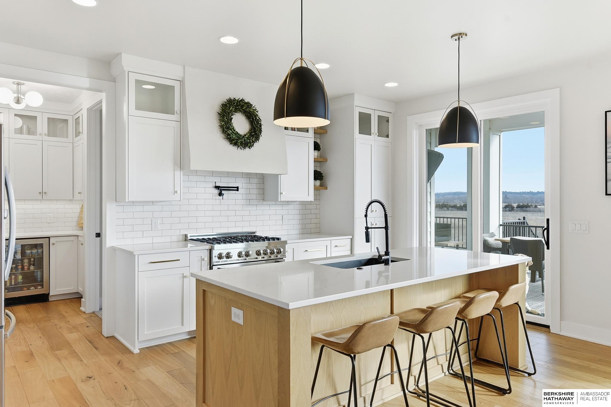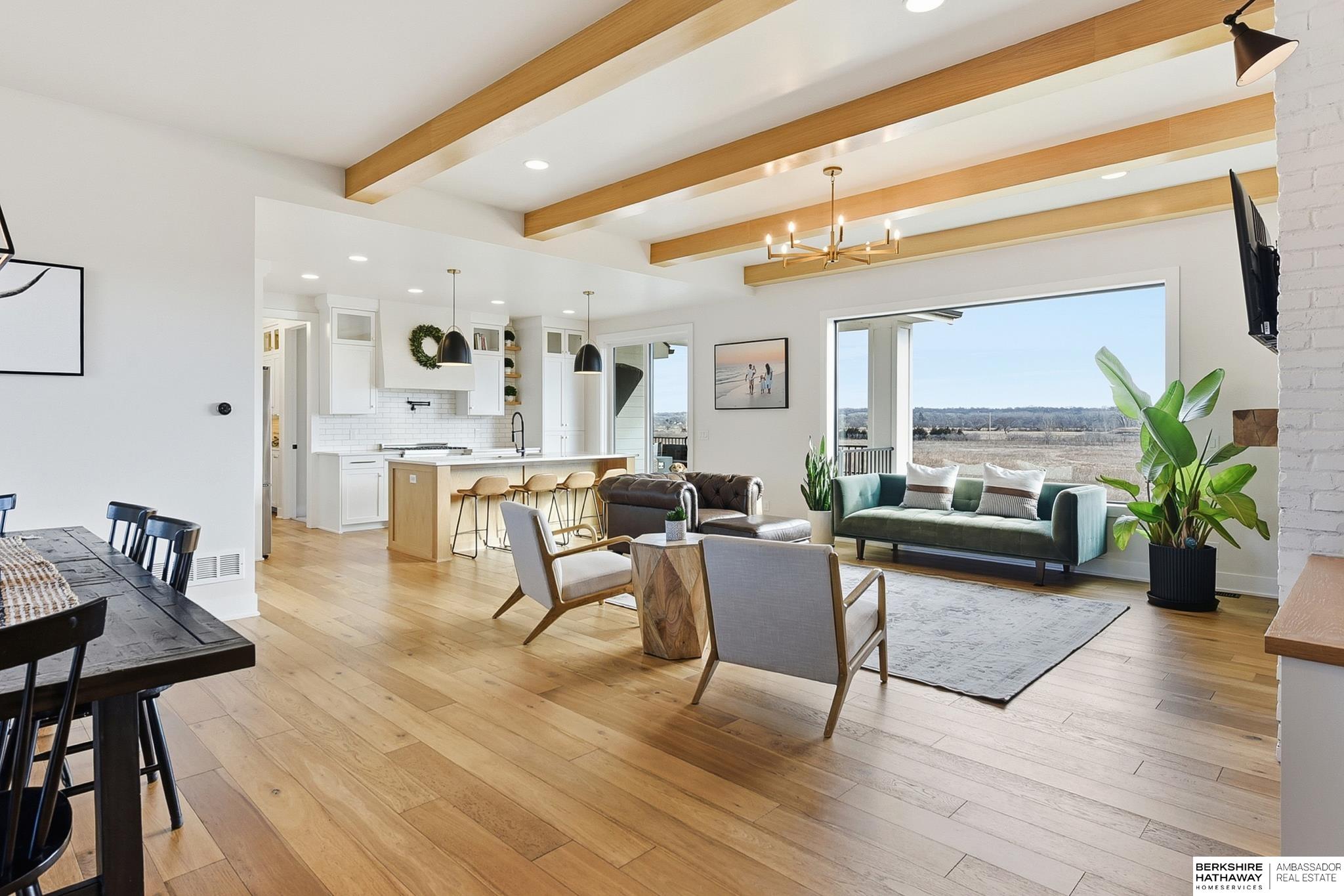 West Shores modern farmhouse home backing to a serene 100-acre HOA-owned wetland preserve. Enjoy access to a 203-acre recreational lake with marina and right to a boat slip, plus nearby trails and park amenities. Ideally located near Dodge and Center Streets, the home offers quick access to Omaha’s main thoroughfares while maintaining a peaceful, private setting. This custom walkout ranch features effortless main-level living with three spacious bedrooms, oversized windows, and abundant natural light. An expanded back deck overlooks the preserve with stunning sunrise views, while the front porch captures sunsets over the lake. The kitchen offers ample cabinetry, refined finishes, and a large butler’s pantry. The spa-like owner’s suite features a soaking tub, heated floor, and expansive walk-in shower. The lower level adds a large versatile bonus room and custom wine wall.