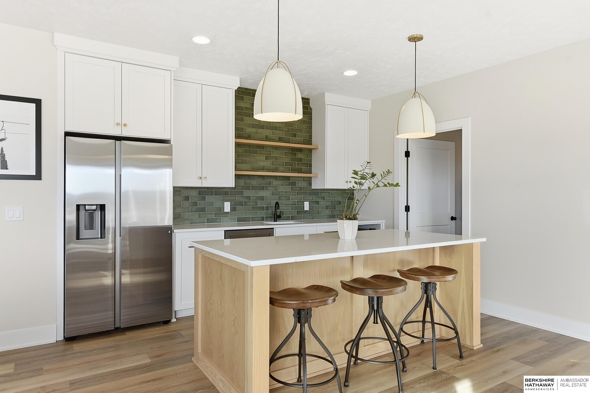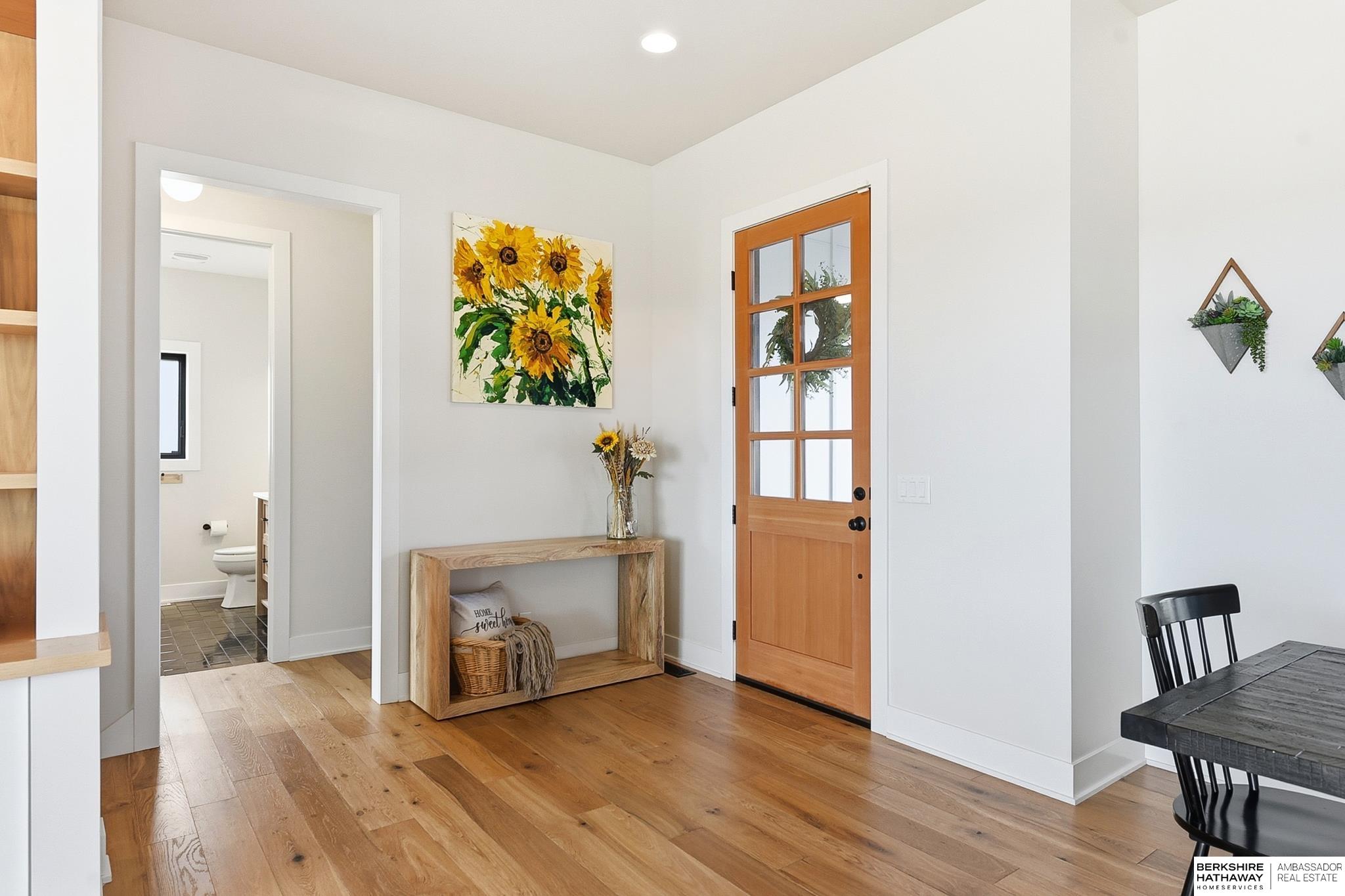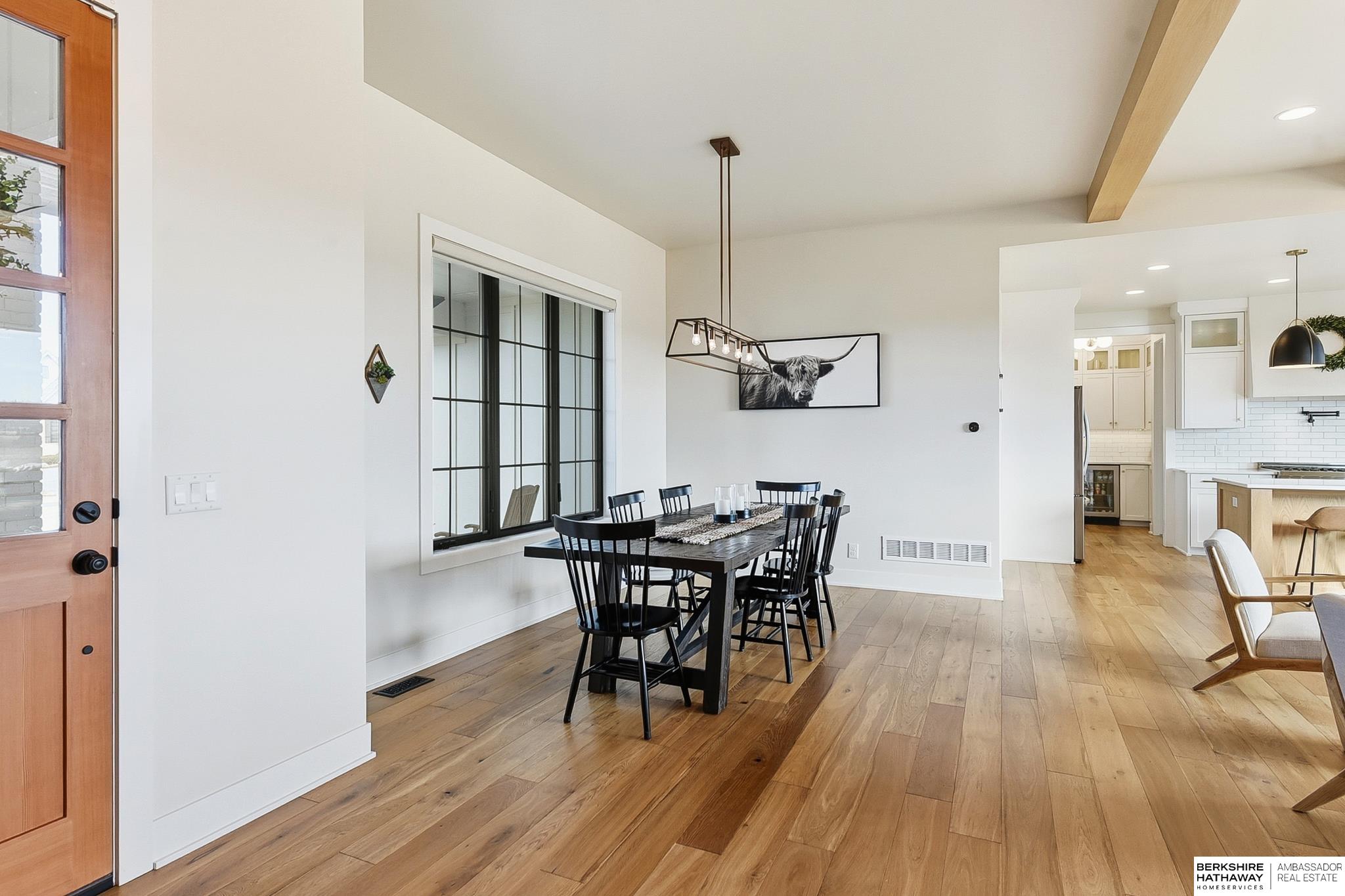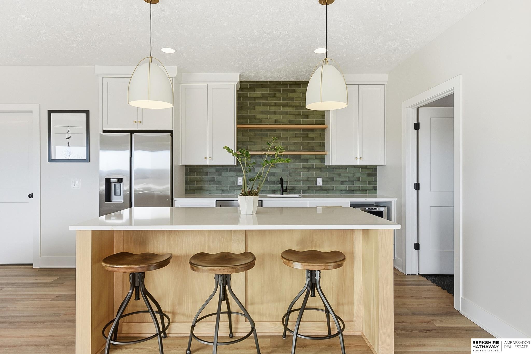 West Shores modern farmhouse home backing to a serene 100-acre HOA-owned wetland preserve. Enjoy access to a 203-acre recreational lake with marina and right to a boat slip, plus nearby trails and park amenities. Ideally located near Dodge and Center Streets, the home offers quick access to Omaha’s main thoroughfares while maintaining a peaceful, private setting. This custom walkout ranch features effortless main-level living with three spacious bedrooms, oversized windows, and abundant natural light. An expanded back deck overlooks the preserve with stunning sunrise views, while the front porch captures sunsets over the lake. The kitchen offers ample cabinetry, refined finishes, and a large butler’s pantry. The spa-like owner’s suite features a soaking tub, heated floor, and expansive walk-in shower. The lower level adds a large versatile bonus room and custom wine wall.